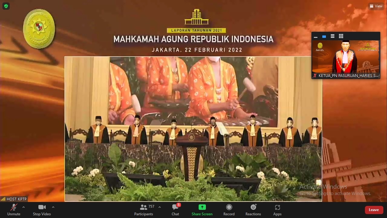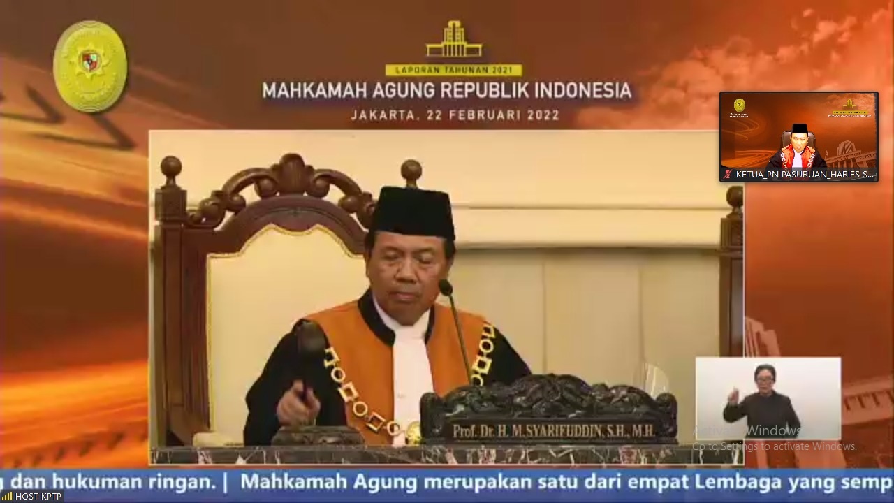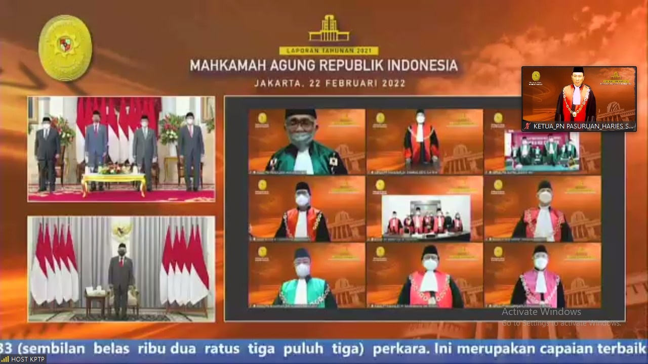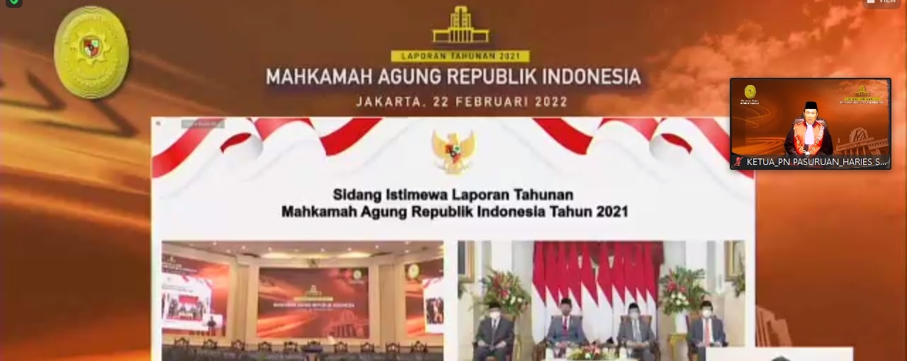 Pasuruan, Selasa (22/02/2022) Bertempat di Ruang Teleconference Pengadilan Negeri Pasuruan, Ketua Pengadilan Negeri Pasuruan Bapak Haries Suharman Lubis, S.H., M.H. mengikuti secara virtual Sidang Istimewa Laporan Tahunan Mahkamah Agung Republik Indonesia Tahun 2021 yang mengusung tema " Akselerasi Perwujudan Peradilan Modern"